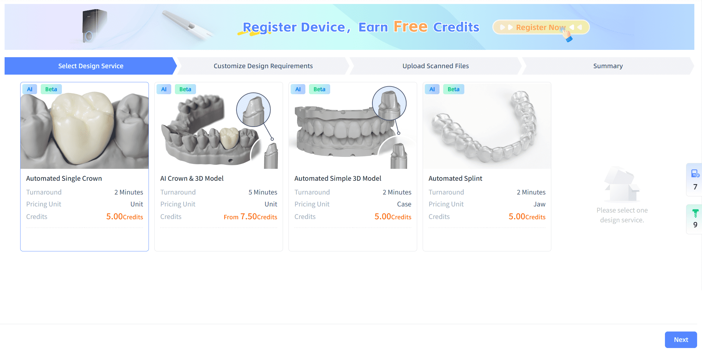 Click Next. In the Customize Design Requirements interface, you can select the target teeth and the design preferences.