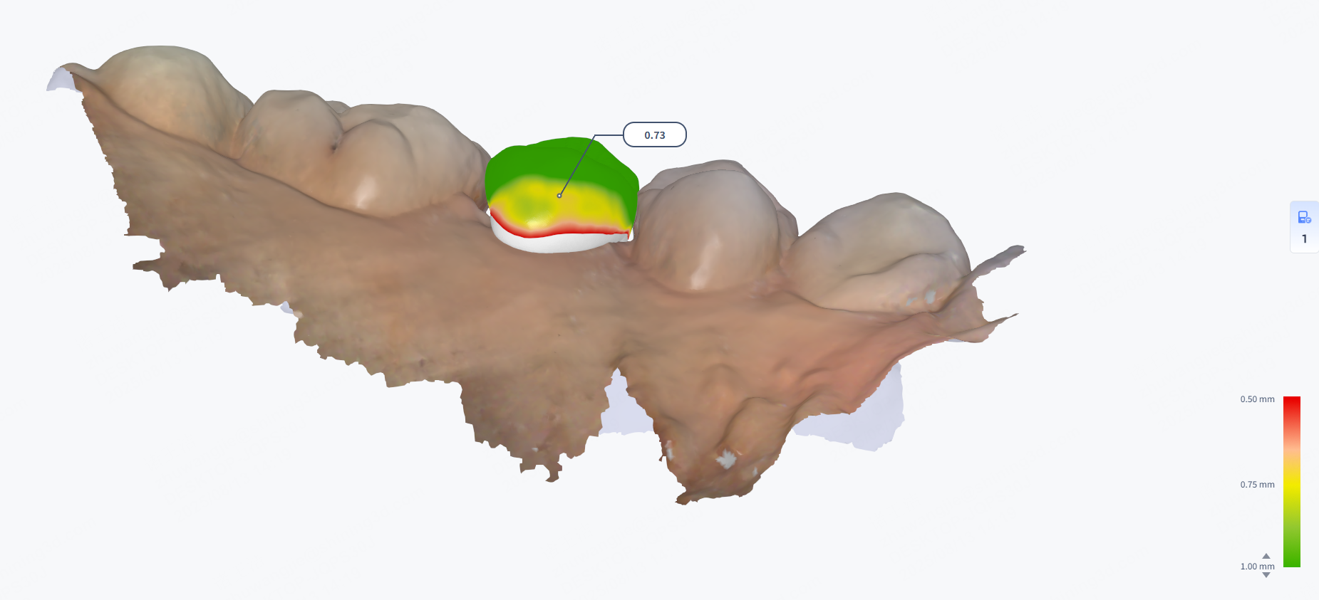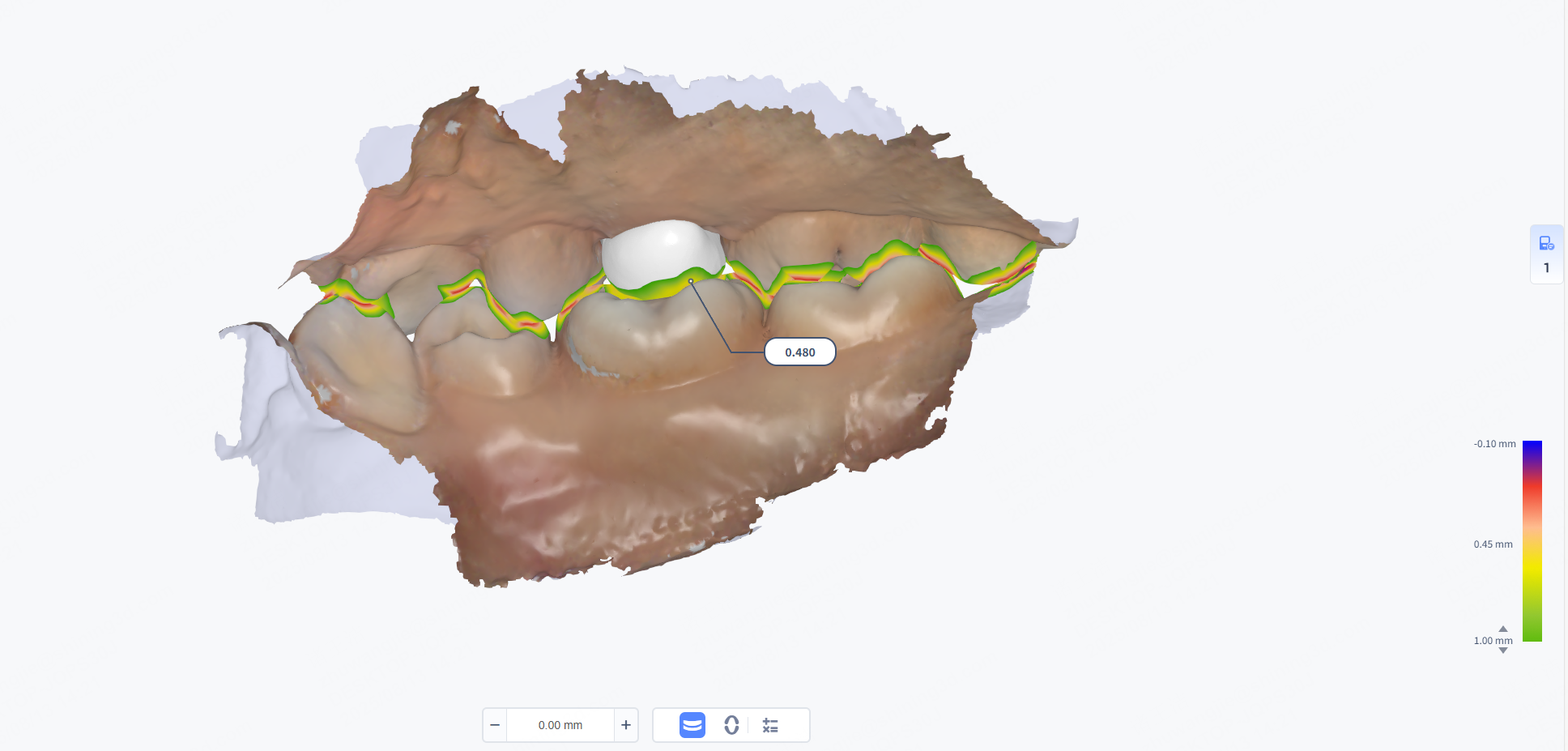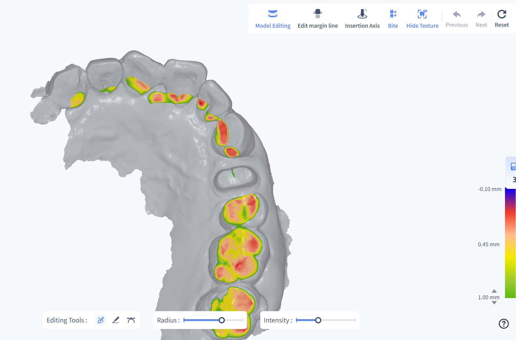 Bite is used to check the occlusal relationship of the upper jaw and the lower jaw. By detecting the collision depth of the jaws, you can judge whether the occlusion is correct. You can view occlusion depth by the color indication and specific values.