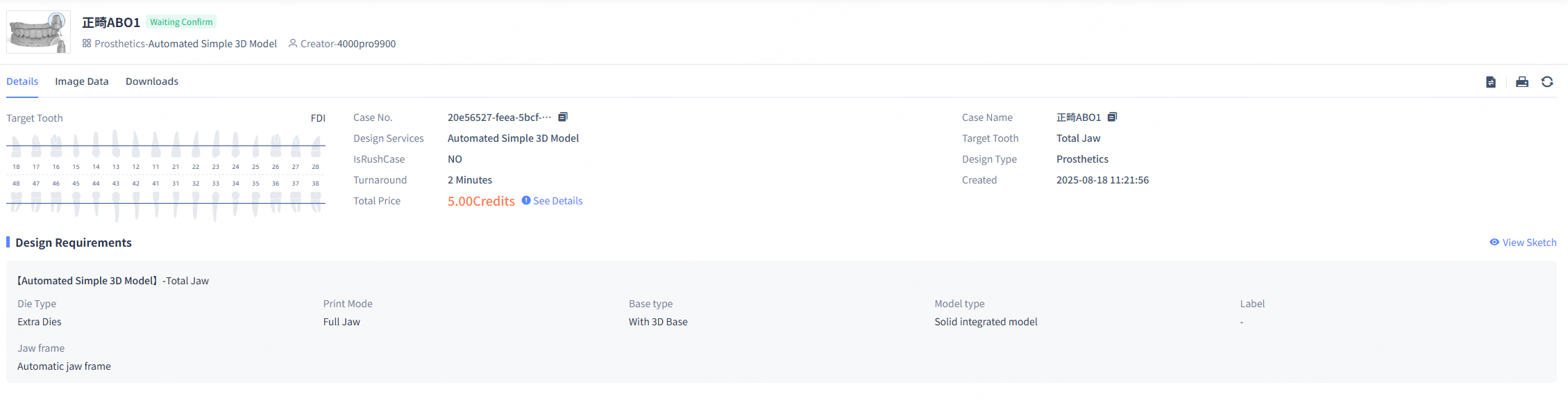 You can view the target tooth, total price, design type and design requirements of the case.