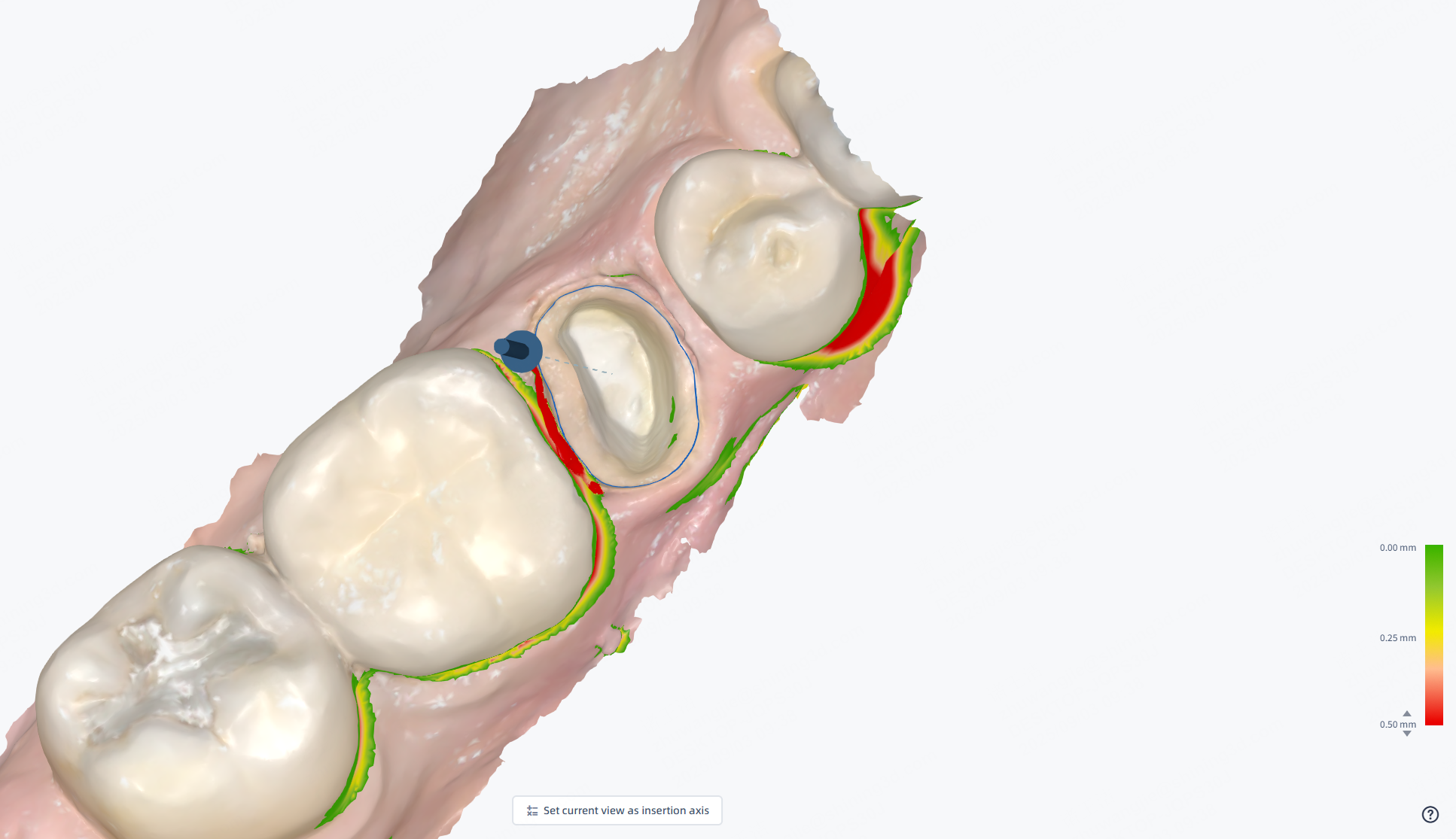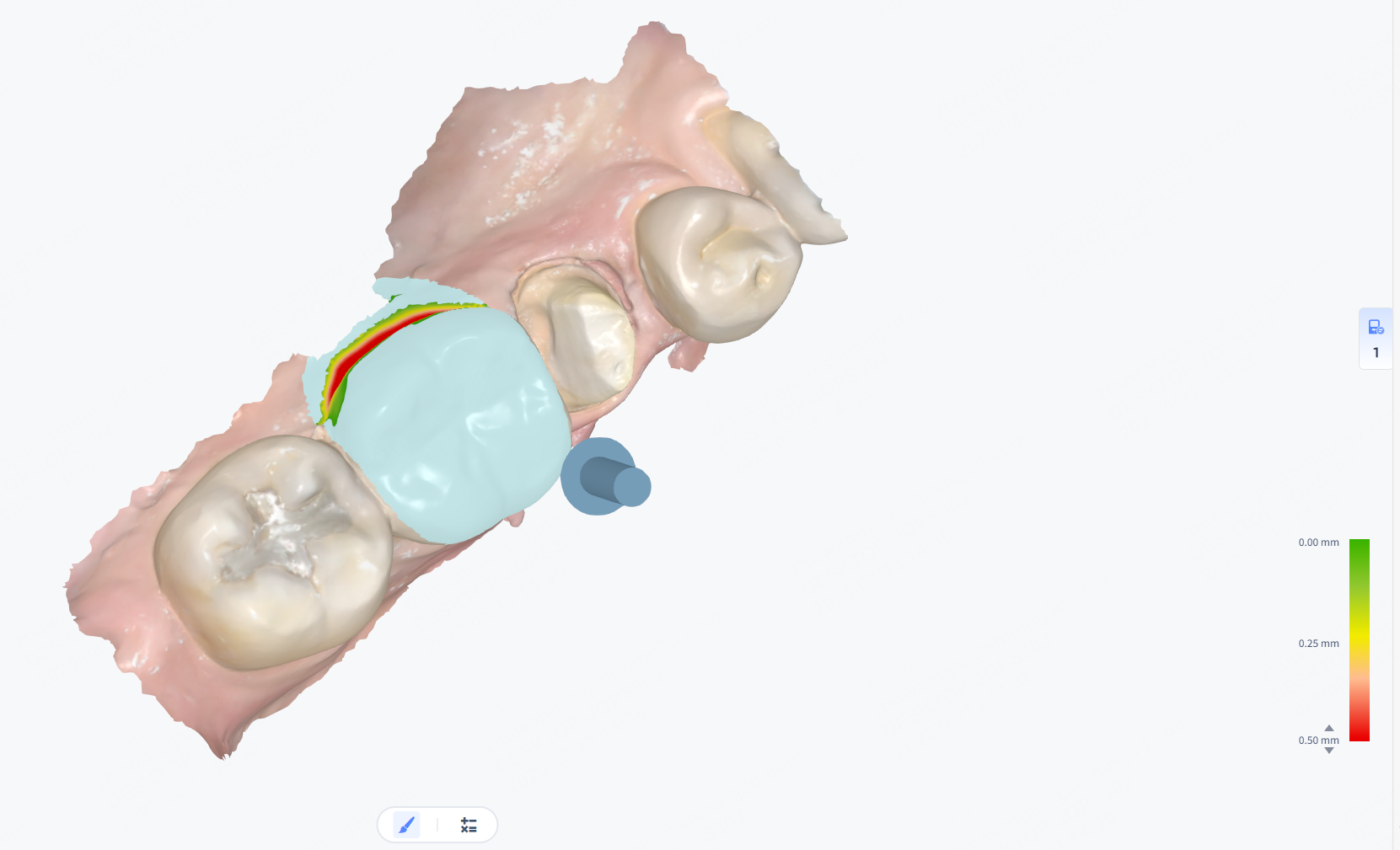 Use the brush to mark the area to check for undercut and calculate the undercut value. Different colors on the model indicate undercut depth, and a color bar appears in the lower right.