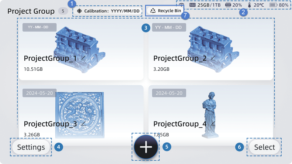 | Recycle Bin | The Recycle Bin contains deleted project groups, projects, and HD images. |