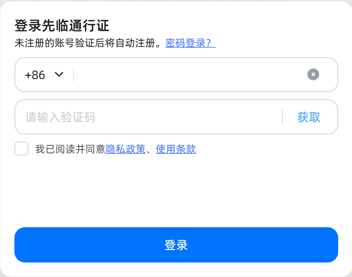 进入登录先临通行证界面后,可以选择验证码登录或密码登录。