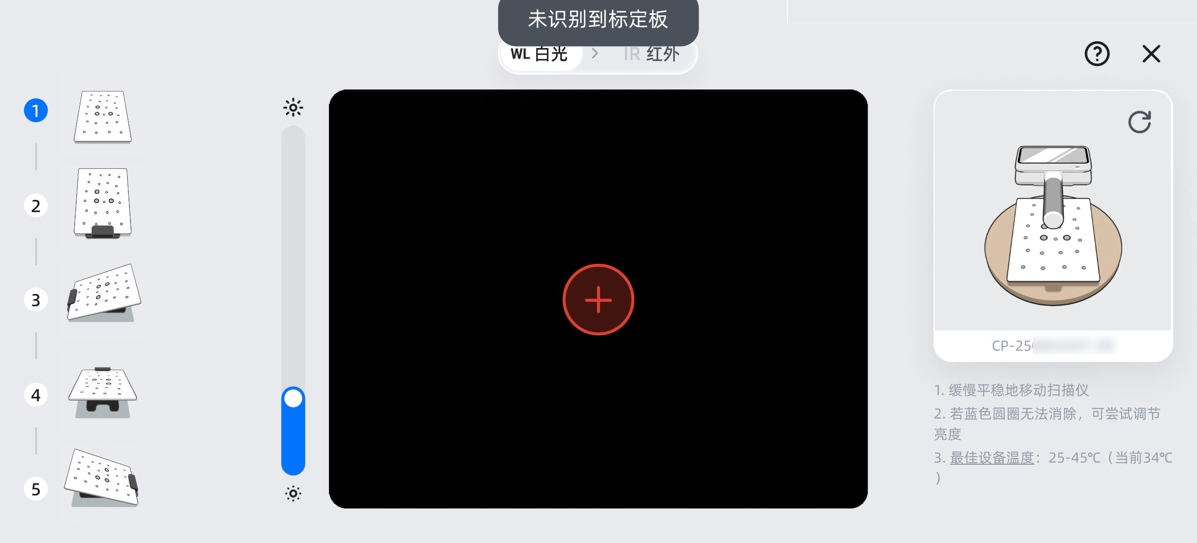 上下移动扫描仪时,若始终无法将蓝色区域全部消除,请尝试通过左侧相机亮度滑动条,调节相机亮度。