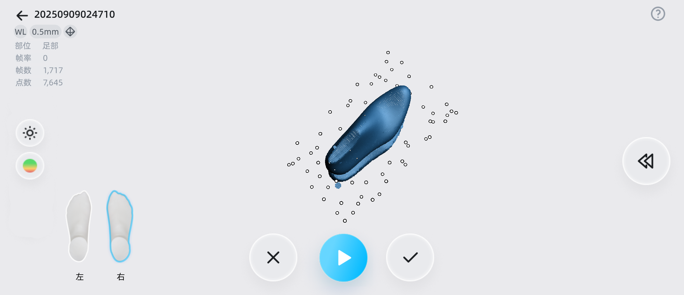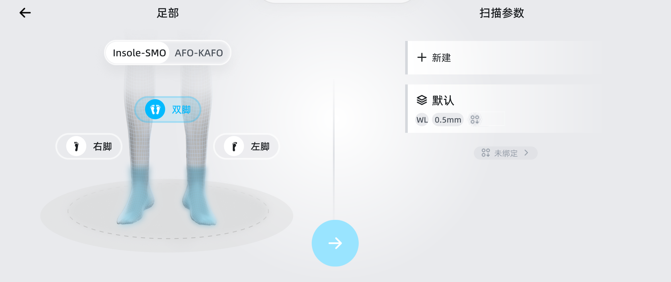 若选择为双脚模式,需要完成双脚扫描,否则无法进行后续的数据编辑和后处理流程。