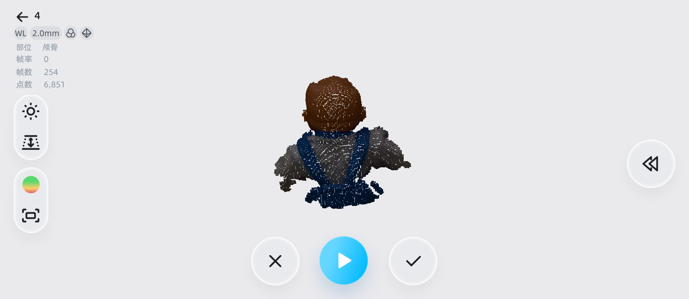 9. 若需回退当前数据的帧数,可轻触 按钮,进入扫描回退功能;若对当前整体数据不满意,可轻触 按钮,清空扫描数据,重新进行扫描。