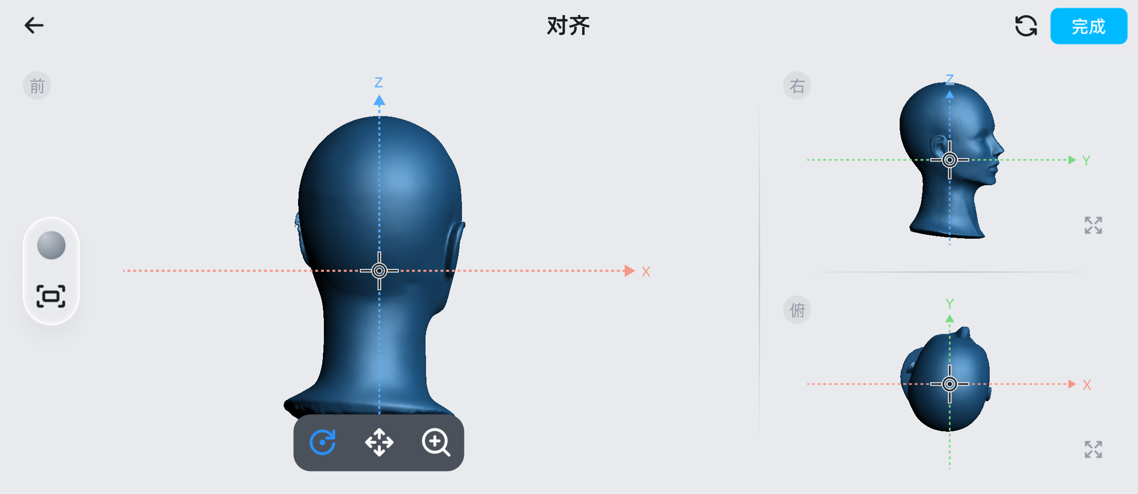 自动生成网格后,将自动进入模型对齐界面。界面默认左侧主视图(模型操作区域)为前视图,右侧小视图(模型预览区域)分别为右视图及俯视图。