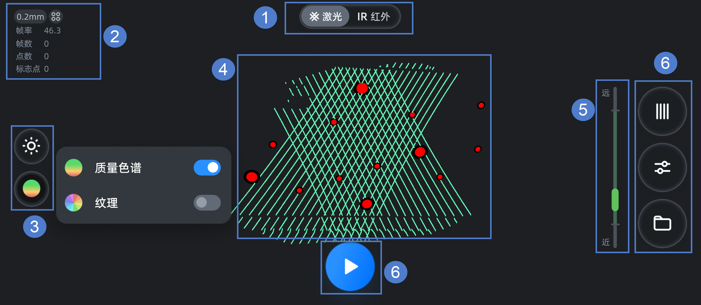 展示当前工程的数据信息,包括帧率、帧数、点数和标志点数(标志点拼接模式或框架点拼接模式)及参数设置。