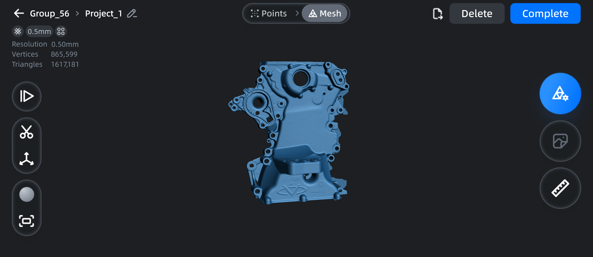 Tippen Sie auf diese Schaltfläche, um das Mesh-Modell in die SHINING 3D Cloud hochzuladen oder in den angegebenen Ordner des Geräts zu exportieren. Siehe Speichern und Exportieren für Details.