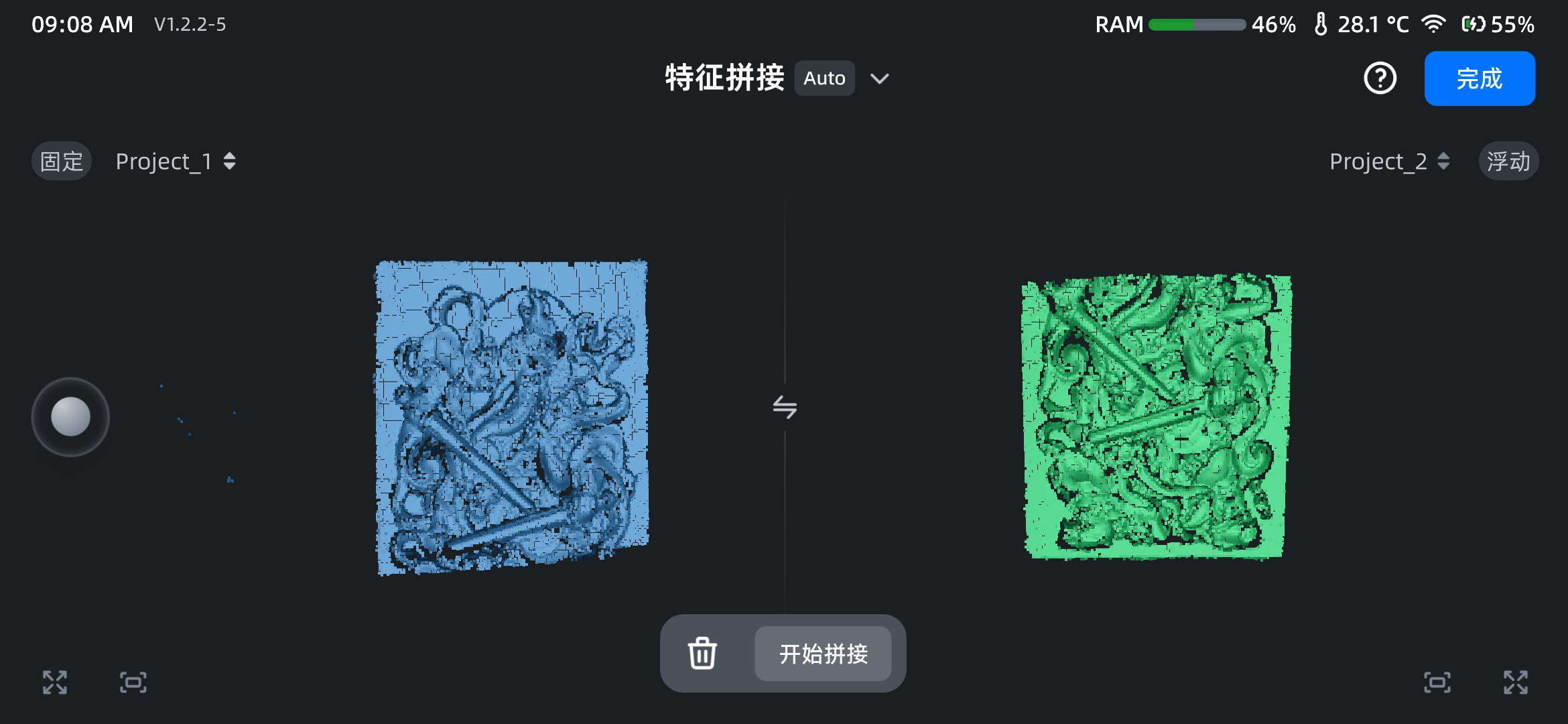 轻触开始拼接,即可进行工程拼接,将浮动窗口的工程拼接至固定窗口的工程上。