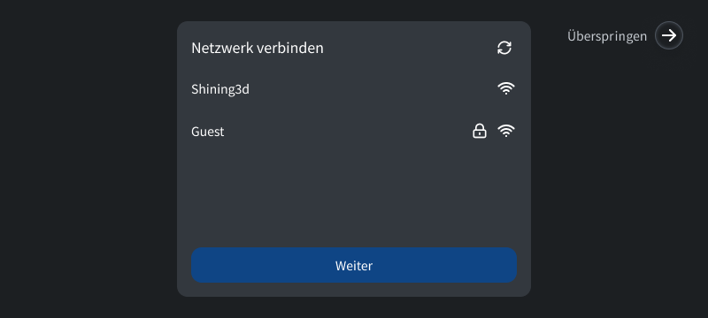 Netzwerkverbindungsfehler", versuchen Sie es bitte erneut oder wechseln Sie das Netzwerk; wenn das Problem weiterhin besteht, starten Sie das Gerät neu. - Wenn Sie sich entscheiden, die Netzwerkverbindung zu Überspringen, um direkt in den Scan-Prozess einzutreten, können die gescannten Daten nicht in die SHINING 3D Digitale Cloud hochgeladen oder auf Ihren Computer übertragen werden.