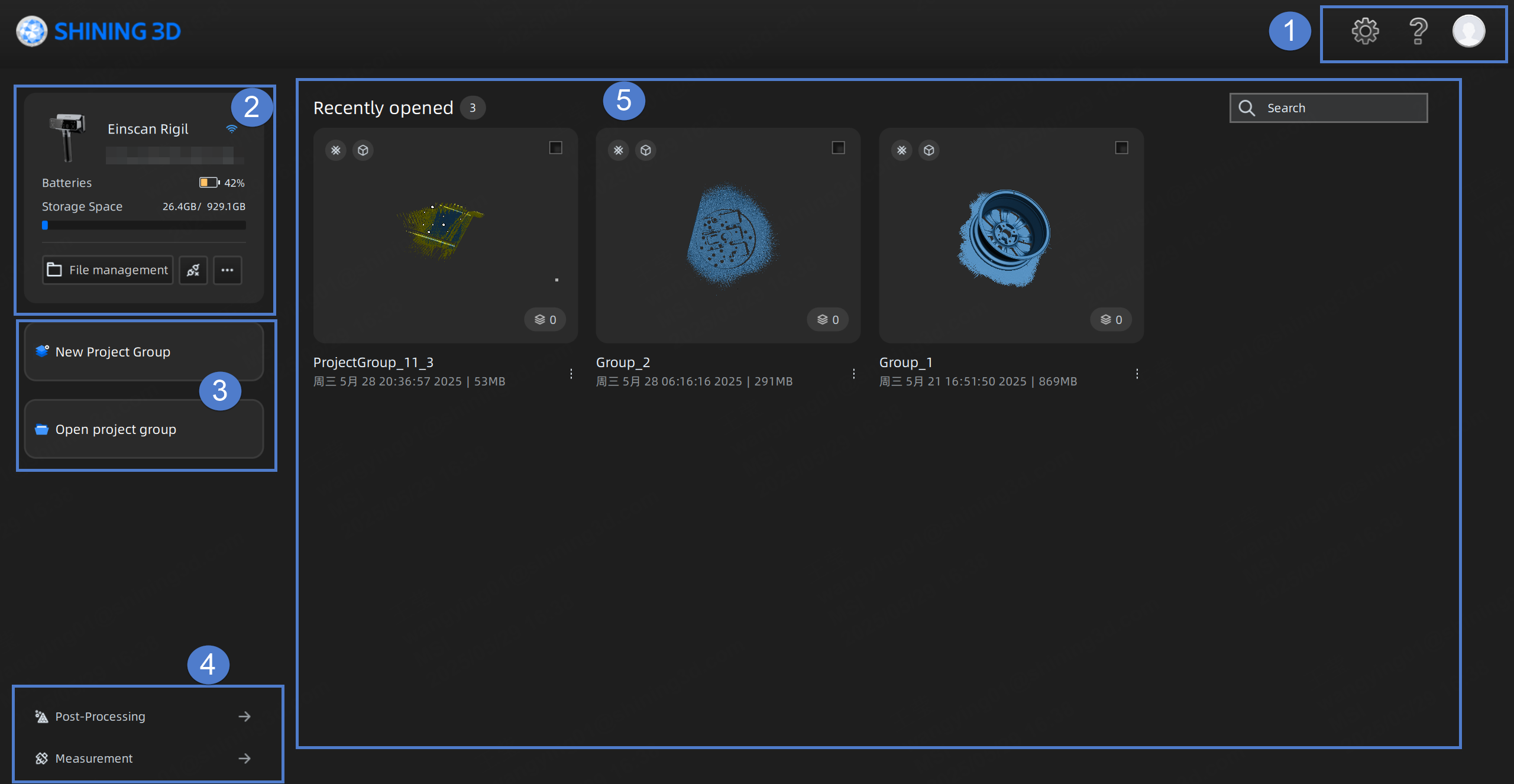 : Klicken Sie hier, um die Projekte in EinScan Rigil zu verwalten.