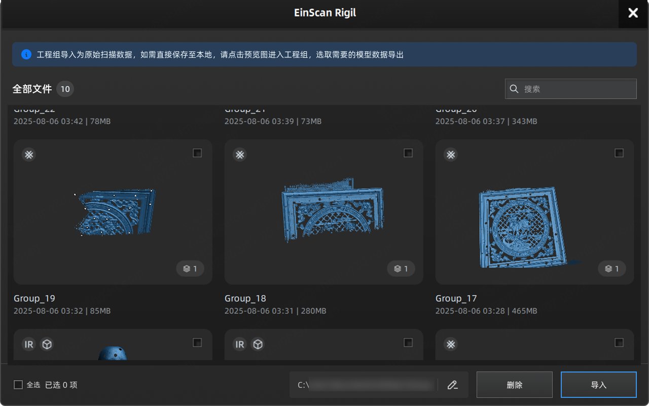 - 勾选工程组可将该工程组的原始扫描数据导入至 EXScan Rigil 中。