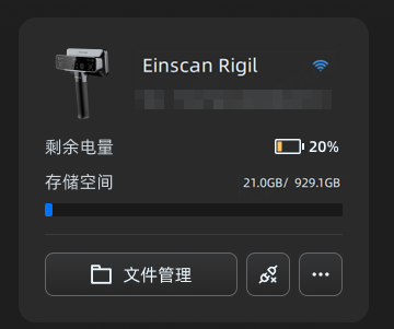 若设备连接成功,此处将显示已连接设备的名称、序列号、电量和存储空间等信息;若设备未连接,请通过无线或有线方式连接设备。