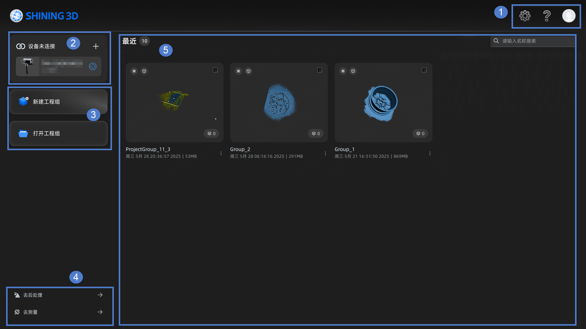 启动软件后,将自动进入软件首页。您可在此界面快速找到最近操作过的工程组文件、打开或新建工程组,或快捷跳转至其他界面。