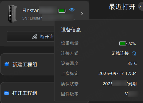 若设备连接成功,此处将显示已连接设备的名称、序列号和电量;若设备未连接,请通过无线或有线方式连接设备。