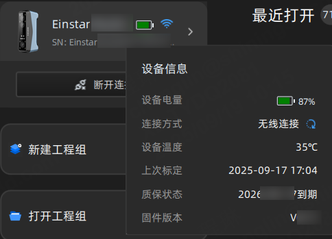 若设备连接成功,此处将显示已连接设备的名称、序列号和电量;若设备未连接,请通过无线或有线方式连接设备。