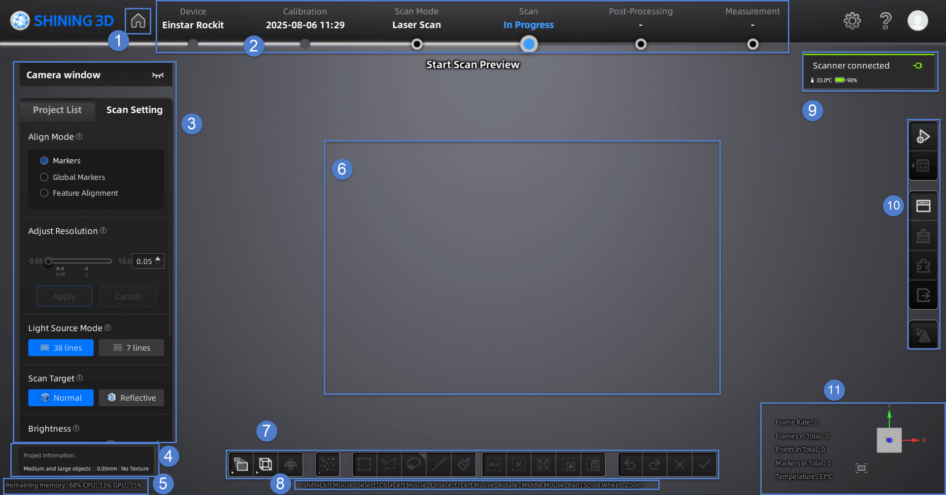 - Camera Windows: To preview the actual scene during scanning. Parameters can be adjusted accurately through the camera window.