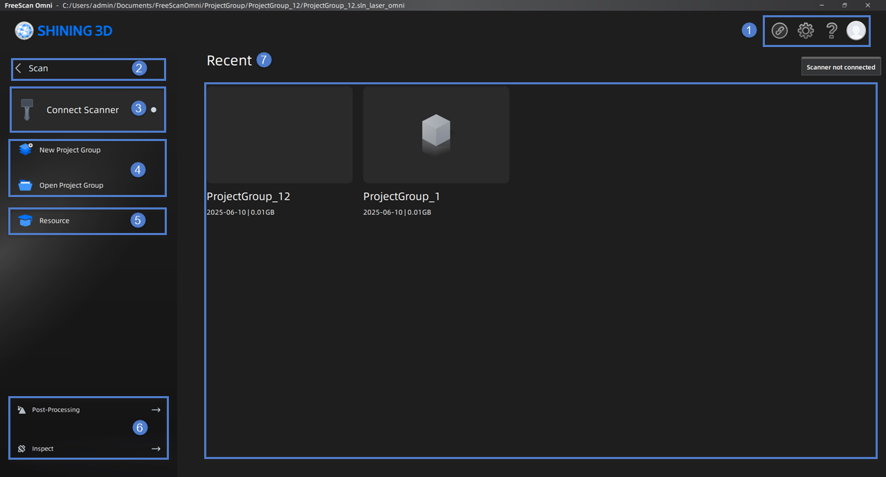 After running the software and completing the login, you will be automatically directed to the software's home page. You can access recent files and links to resources, create project groups as well as jump to other interfaces quickly.