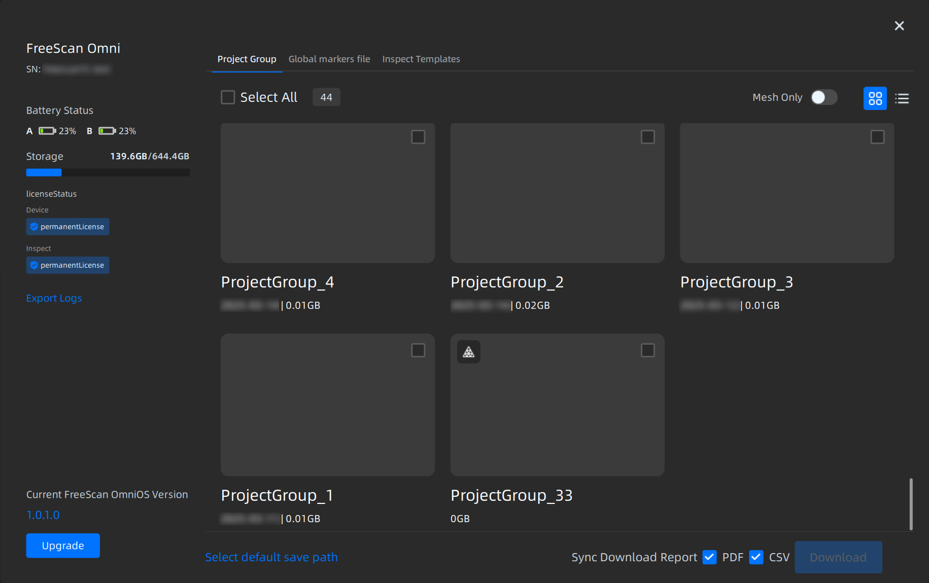 - Export project groups and global markers file from the device to your PC.