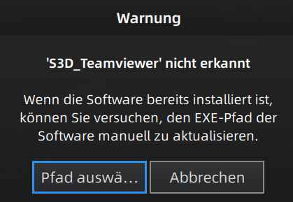 Wenn die Software beim Verwenden der Remoteunterstützungsfunktion ein Popup mit der Meldung „S3D_TeamViewer nicht erkannt“ anzeigt, können Sie im Dialogfeld auf Pfad auswählen klicken und die EXE-Datei von TeamViewer auswählen, um den Startpfad für TeamViewer manuell zu aktualisieren.