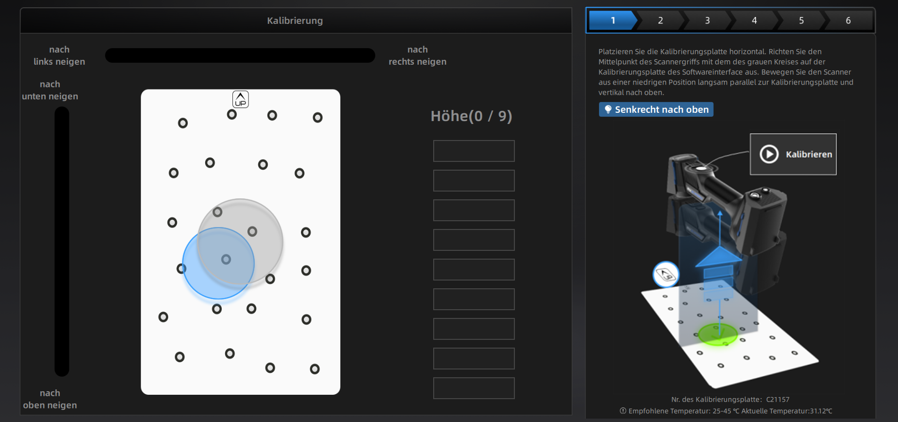 Bewegen Sie das Gerät langsam und passen Sie den Abstand zwischen dem Scanner und dem Kalibrierungsbrett entsprechend der Anzeige des Höhenfelds an.