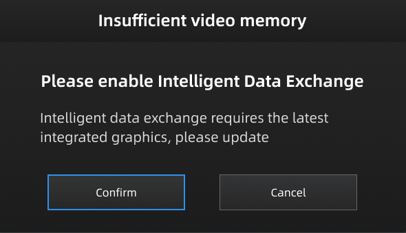 When the performance of the discrete graphics card has reached its limit, you can follow the on-screen prompt to enable Intelligent Data Exchange and switch to the integrated graphics card in order to prevent scanning issues caused by insufficient video memory.