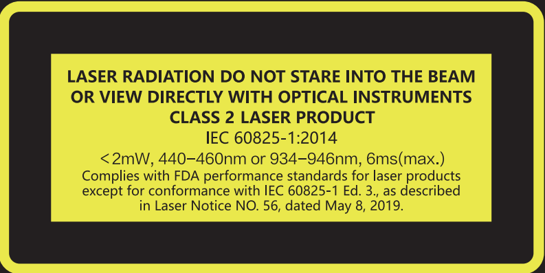 Complies with FDA performance standards for laser products except for conformance with IEC 60825-1 Ed.3., as described in Laser Notice No.56, dated May 8, 2019.