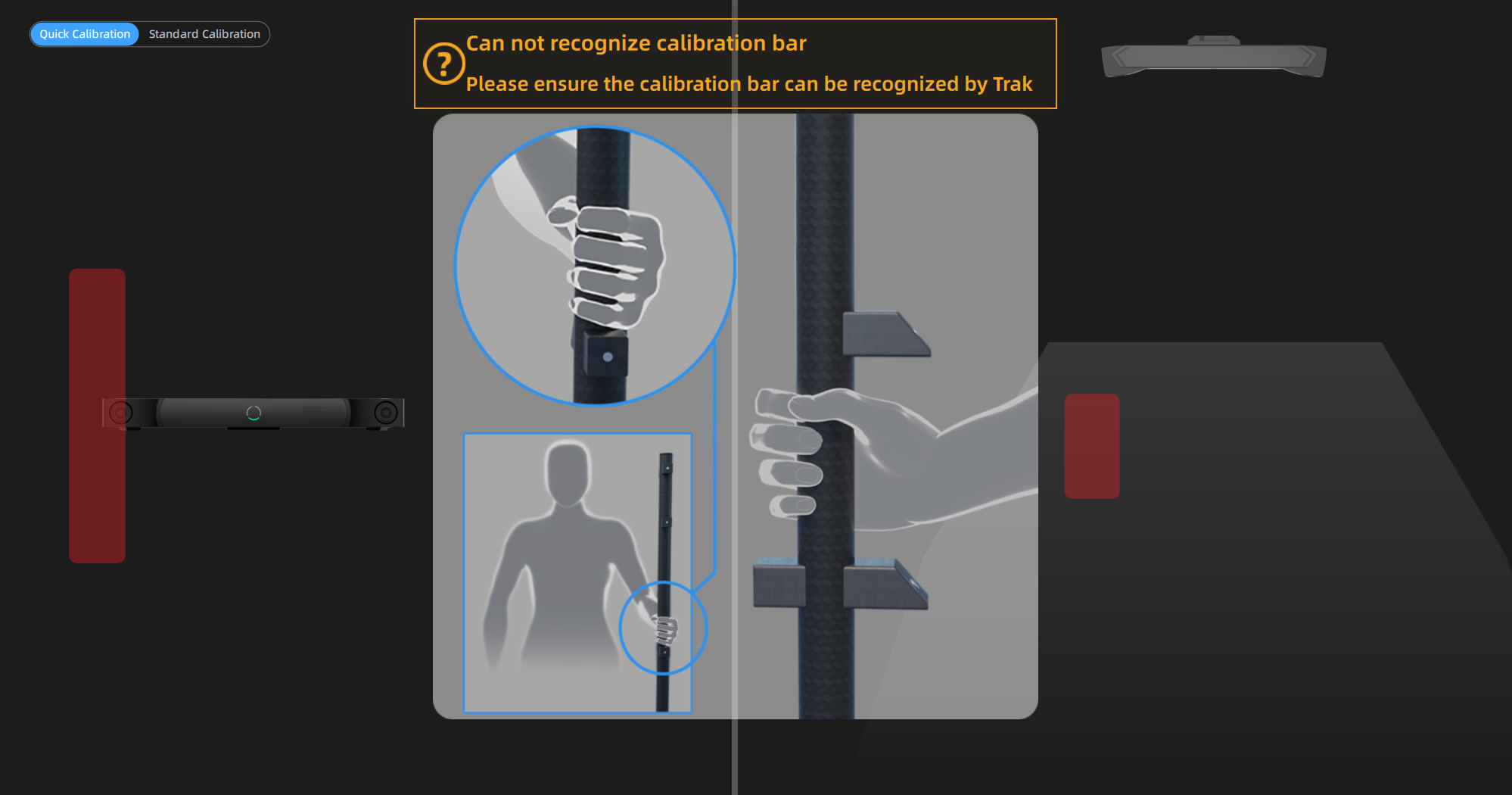 • Wenn der Tracker den Kalibrierstab nicht erkennt, folgen Sie bitte den Anweisungen und passen Sie die Richtung des Kalibrierstabs an, um sicherzustellen, dass er in der Frontalansicht und der Draufsicht in der richtigen Position ist.