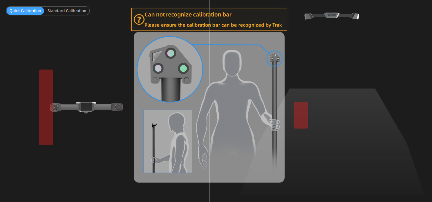 - If the tracker fails to identify the calibration rod, please follow the guidance and adjust the direction of the calibration rod to make sure it is at a right position in the front view and the top view.