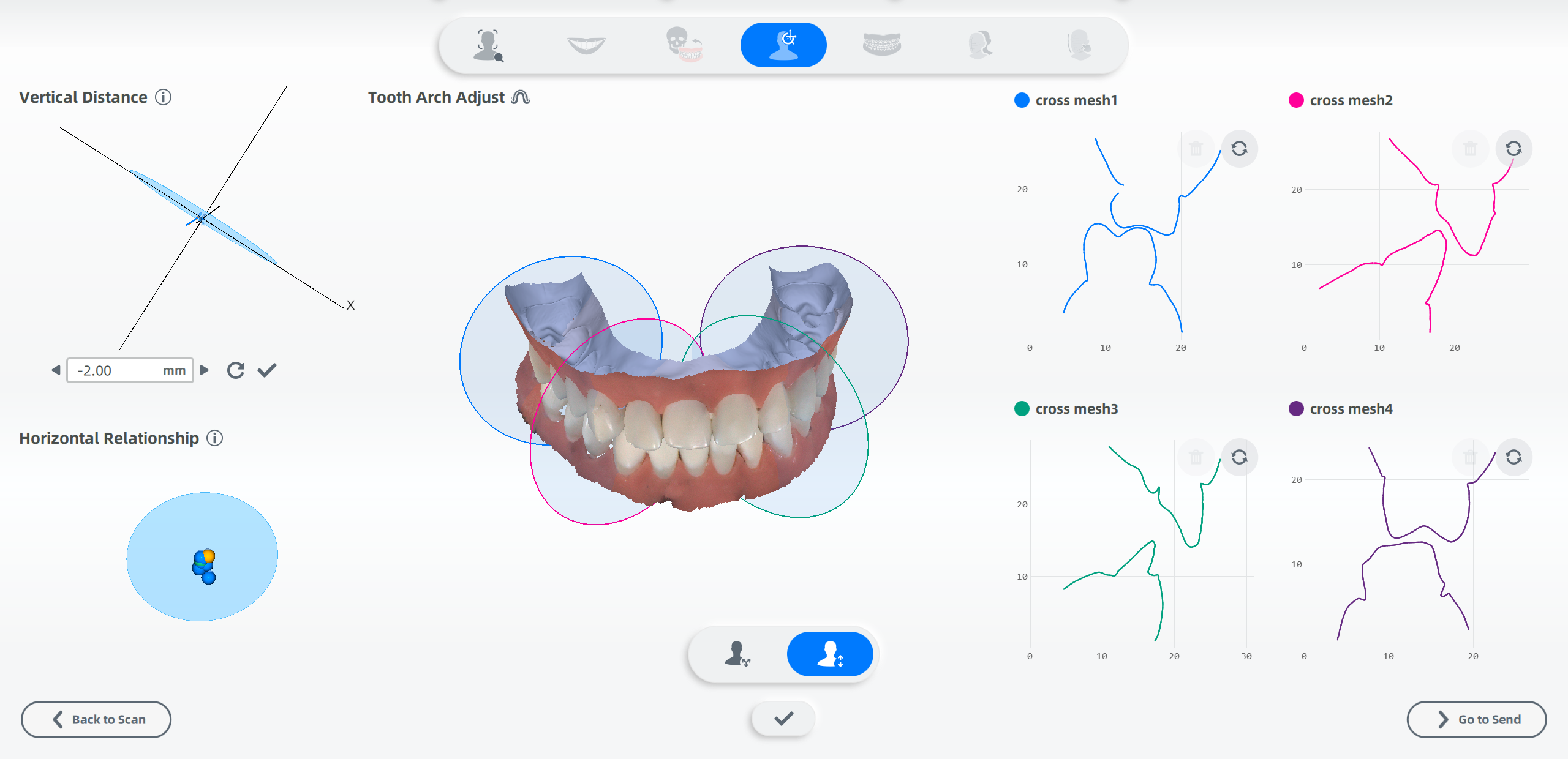 The software will automatically generate four circular planes distributed along the dental arch based on vertical distance. These planes intersect with the upper and lower jaws to form sections.
