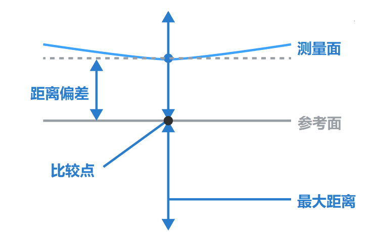 测量数据为网格数据时,构建一个线段来获取与多边形网格的交点,该线段以比较点为中心,与比较点的法向量同轴,长度是最大距离的两倍。曲面点距离的偏差即为该交点与比较点之间的距离。(若交点在线段正向方向上与网格数据相交,则偏差符号为正;若交点在线段反向方向上与网格数据相交,则偏差符号为负)。