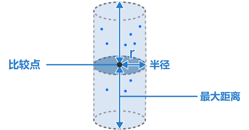 测量数据为点云数据时,构建一个圆柱来获取点集,该圆柱以比较点为中心,半径为圆柱半径,轴线与比较点的轴线同轴,长度等于最大距离的两倍。找出点云在该圆柱体内的点集,并根据“最大角度”过滤掉不符合条件的点,求出剩余点到圆盘的加权平均值,即为曲面点距离的偏差。(圆盘为以比较点为中心,半径为半径,比较点法向为法向的切平面)。