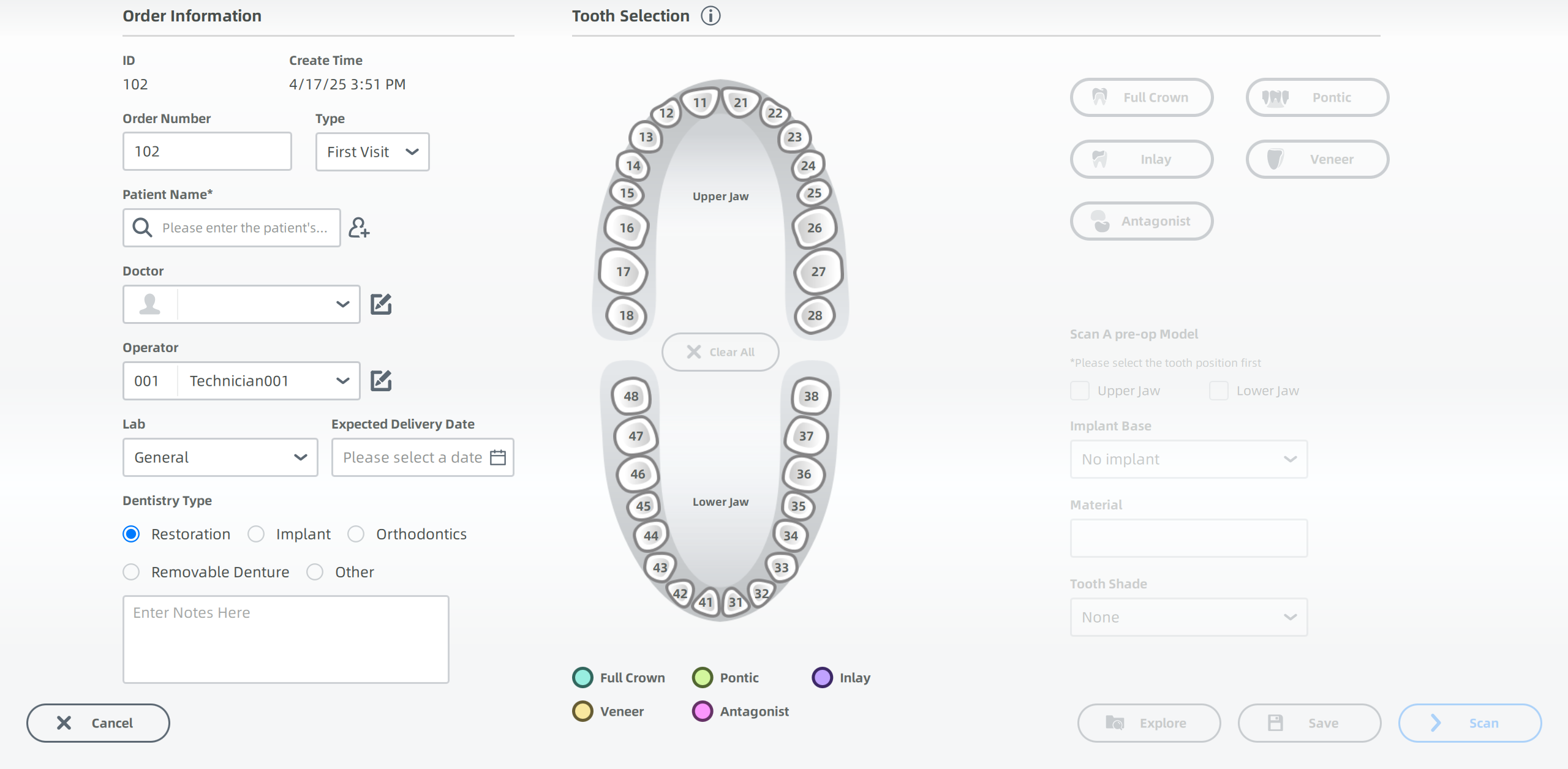 Create different kinds of orders according to the scanning results. Orders will show the types of patients, tooth place and scanning process.