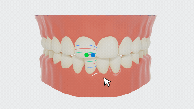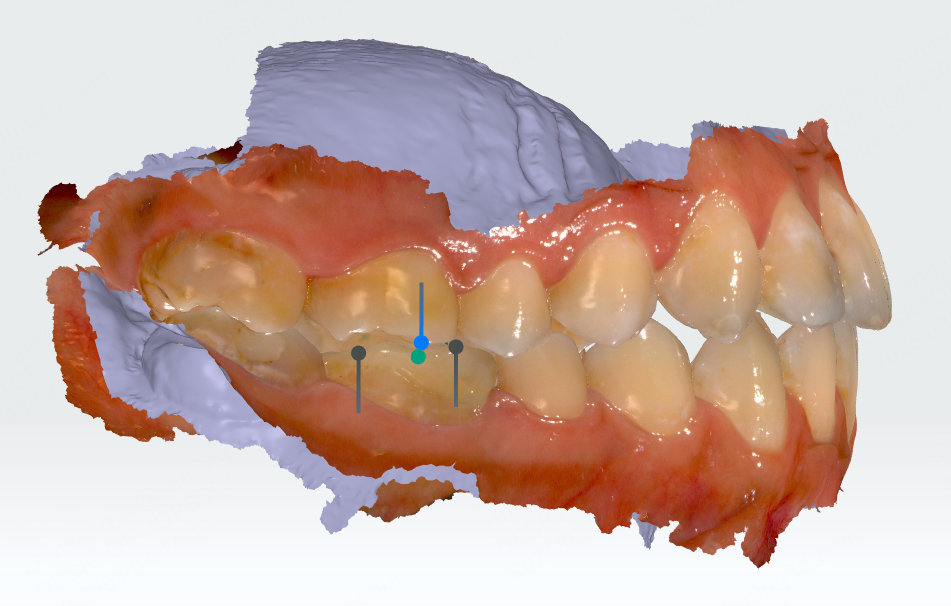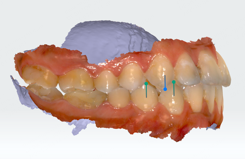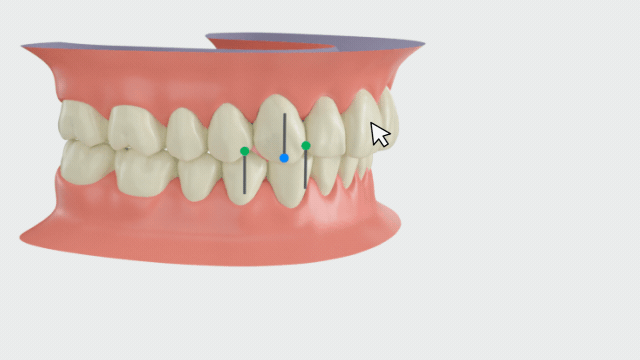 Click to enter overbite and overjet measurement. Teeth with overbite and overjet relationships will be automatically detected. Feature lines at ⅓, ½, and ⅔ of the crown and feature points will be generated.