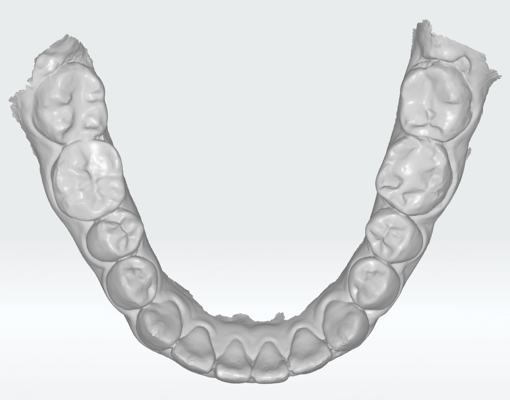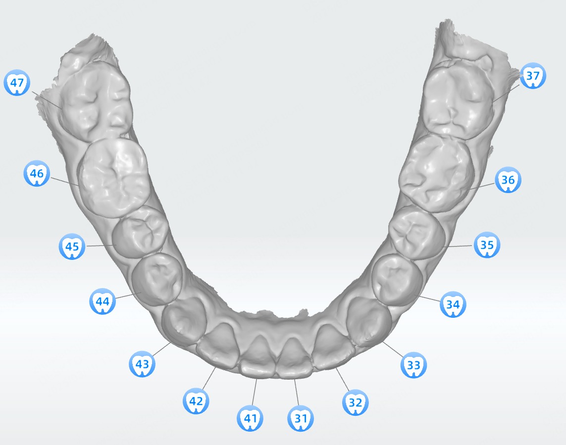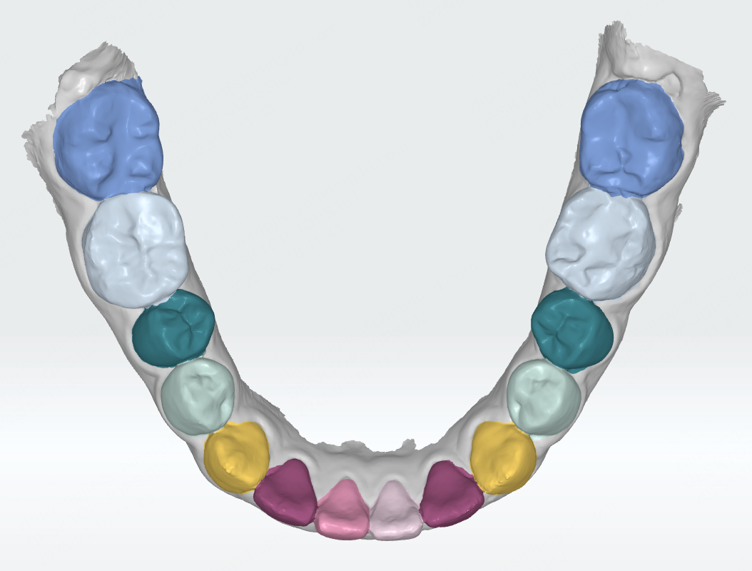 On the interface of segment, models of upper jaw and lower jaw are displayed separately. The software automatically recognizes each tooth with different colors and displays teeth numbers. Users can preview the upper jaw and lower jaw from different perspectives, check the teeth numbers, edit teeth areas, remove teeth and add teeth.