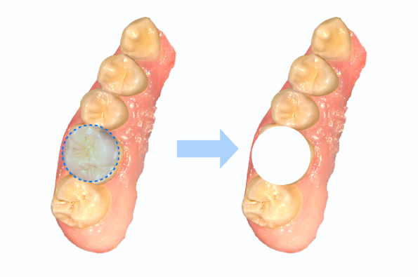 Scan the post-op upper jaw and the post-op lower jaw. In this step, you can dig a hole on the treated tooth and make tooth preparation.
