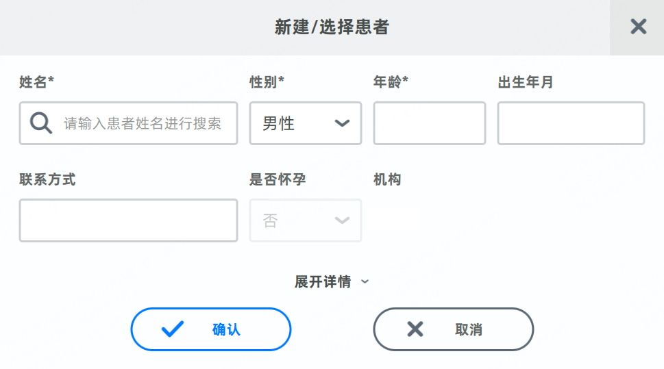- 若无患者,可输入患者姓名、性别和年龄等必填信息新建患者。