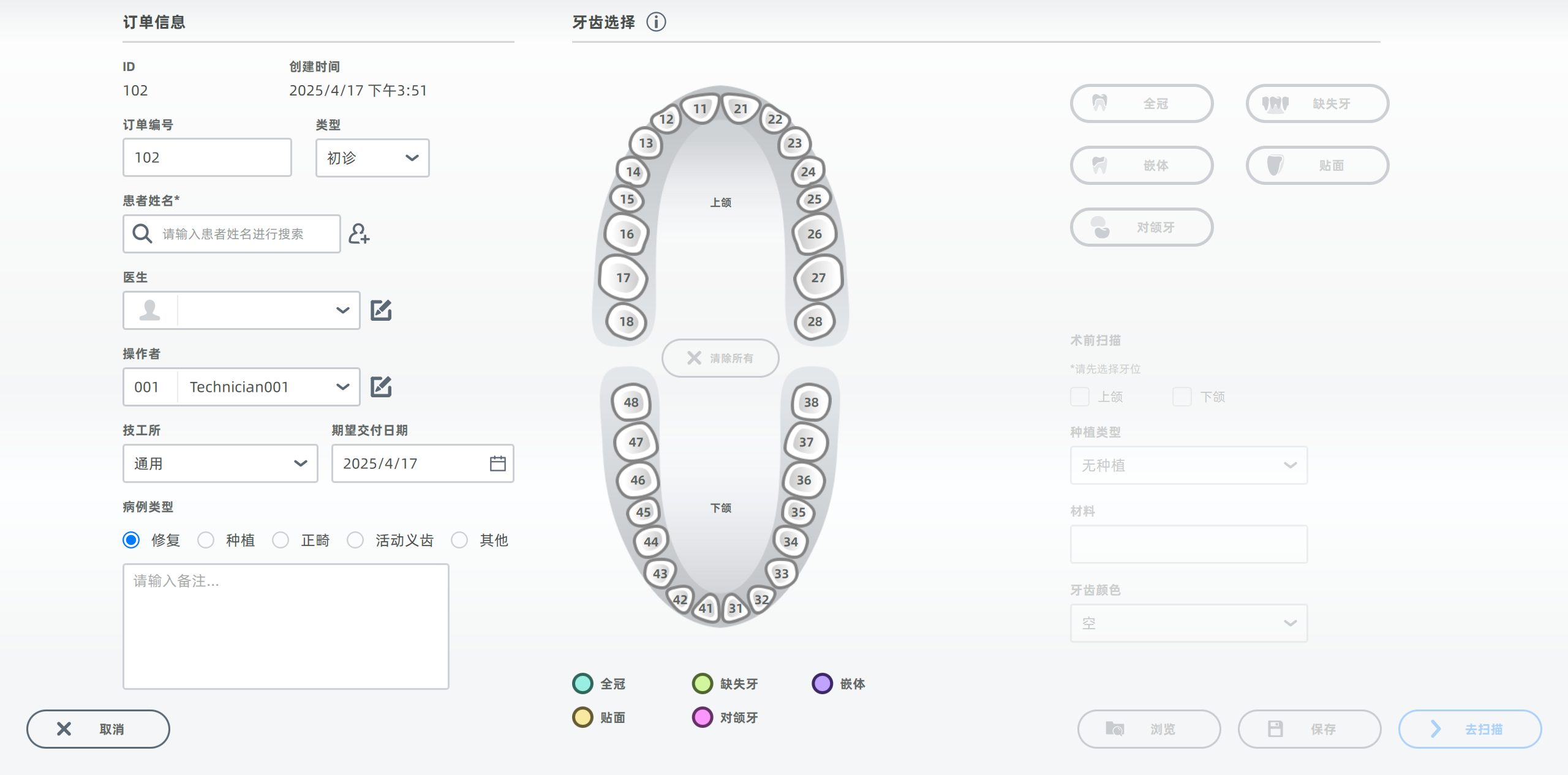根据不同扫描病例,创建不同类型的订单。通过创建订单定义病例类型、牙位及扫描流程。