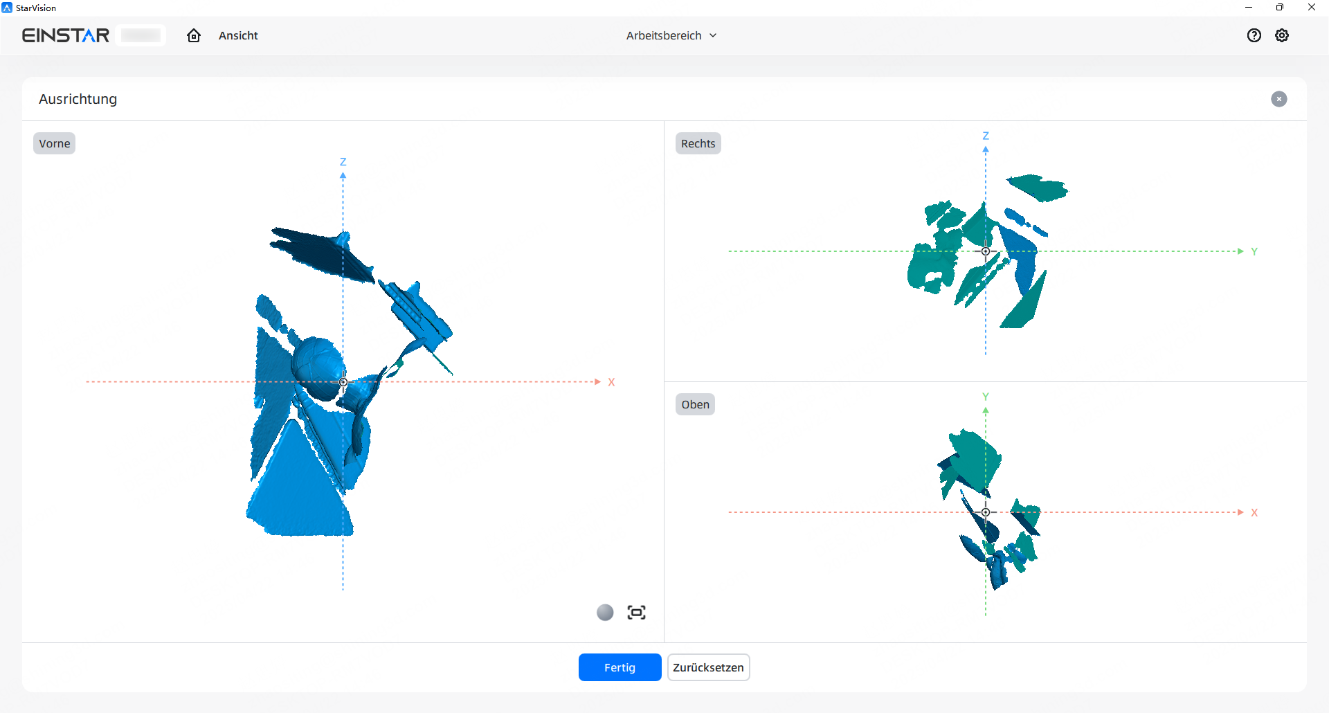Während der Modellausrichtung können Sie das Modell in den drei Ansichtsbereichen verschieben, drehen und skalieren (für spezifische Gestenoperationen siehe die Operationen); jede Verschiebung und Drehung des Modells in einem Ansichtsbereich wird in Echtzeit in den anderen Ansichtsbereichen angewendet.