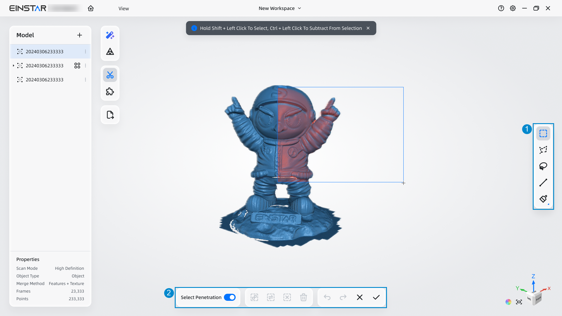 | Free selection | In the model area, press Shift+left-button and drag to draw a selection area by moving the cursor along a path.![]() |