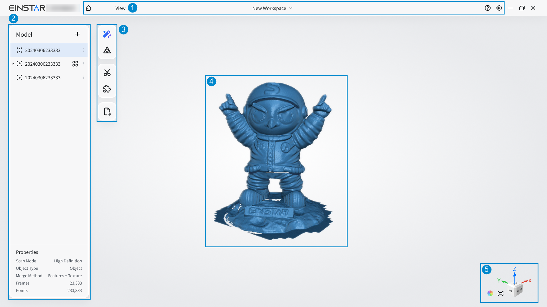 The post-processing workflow on the computer is mainly done in theWorkspace, where you can choose to create a new workspace or import existing project files for post-processing.