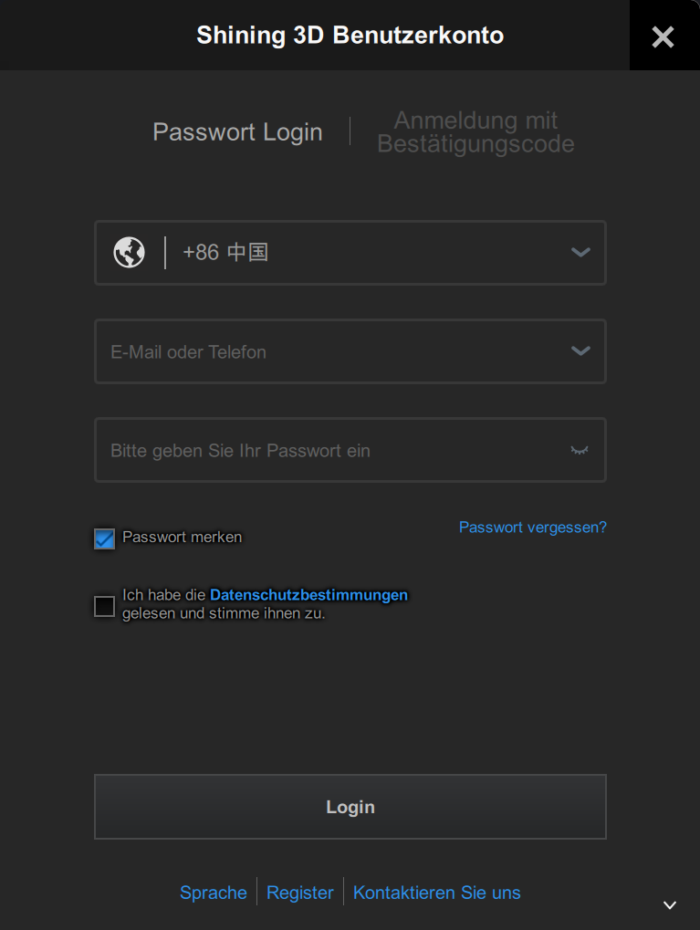 Wenn Sie ein neuer Benutzer sind, registrieren Sie bitte zuerst ein Benutzerkonto. Sie können im Pop-up-Fenster beim Öffnen der Software auf Registrieren klicken oder auf Anmelden auf unserer Benutzerkonto-Website: https://passport.shining3d.com/signup klicken.
