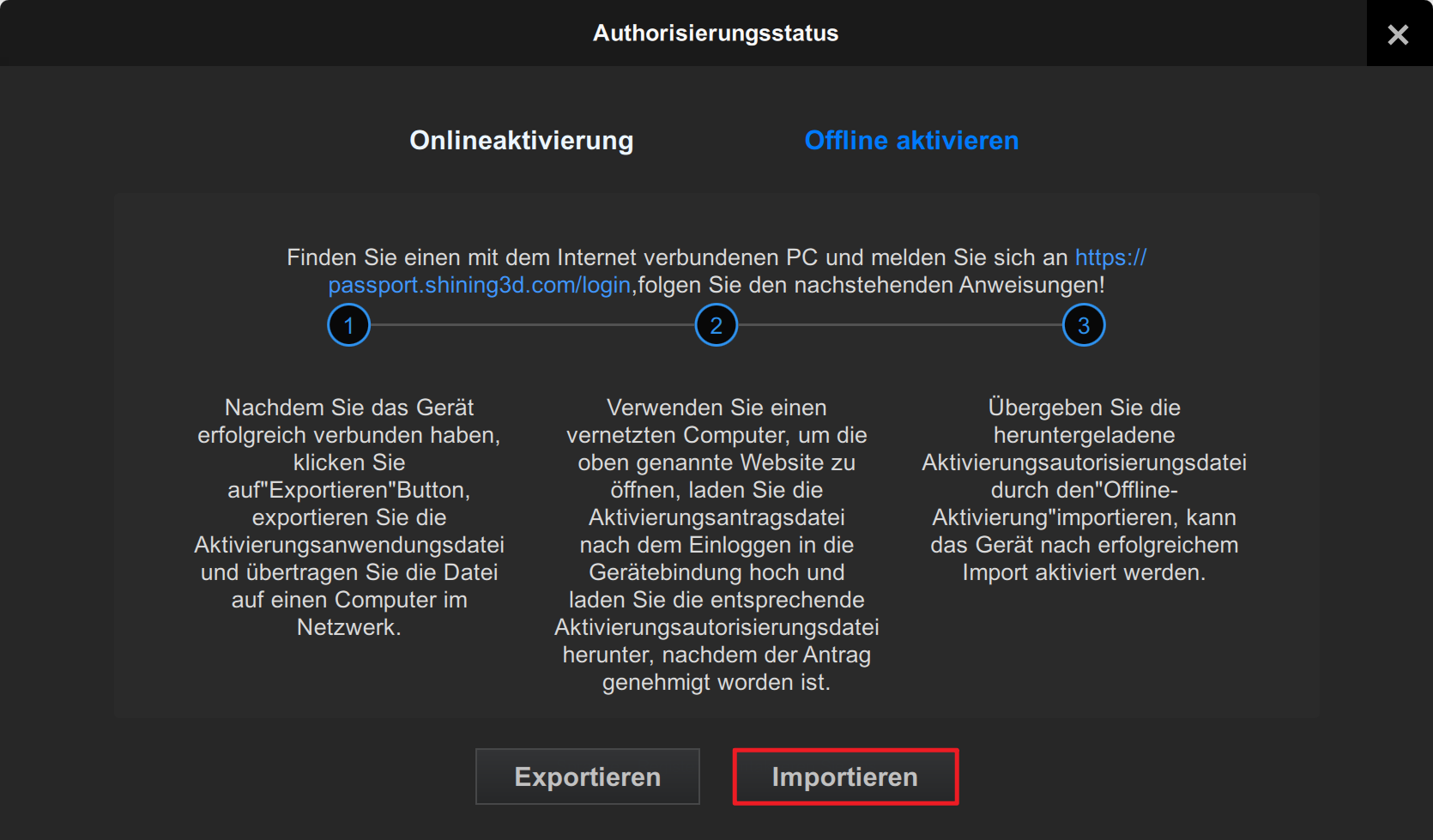 Melden Sie sich auf dem Computer, der mit dem Internet verbunden ist, bei https://passport.shining3d.com/ an, laden Sie Ihre C2V-Datei auf der Seite Offline-Aktivierung hoch, klicken Sie auf Aktivierung und gehen Sie zur entsprechenden Seite, um die V2C-Datei herunterzuladen.