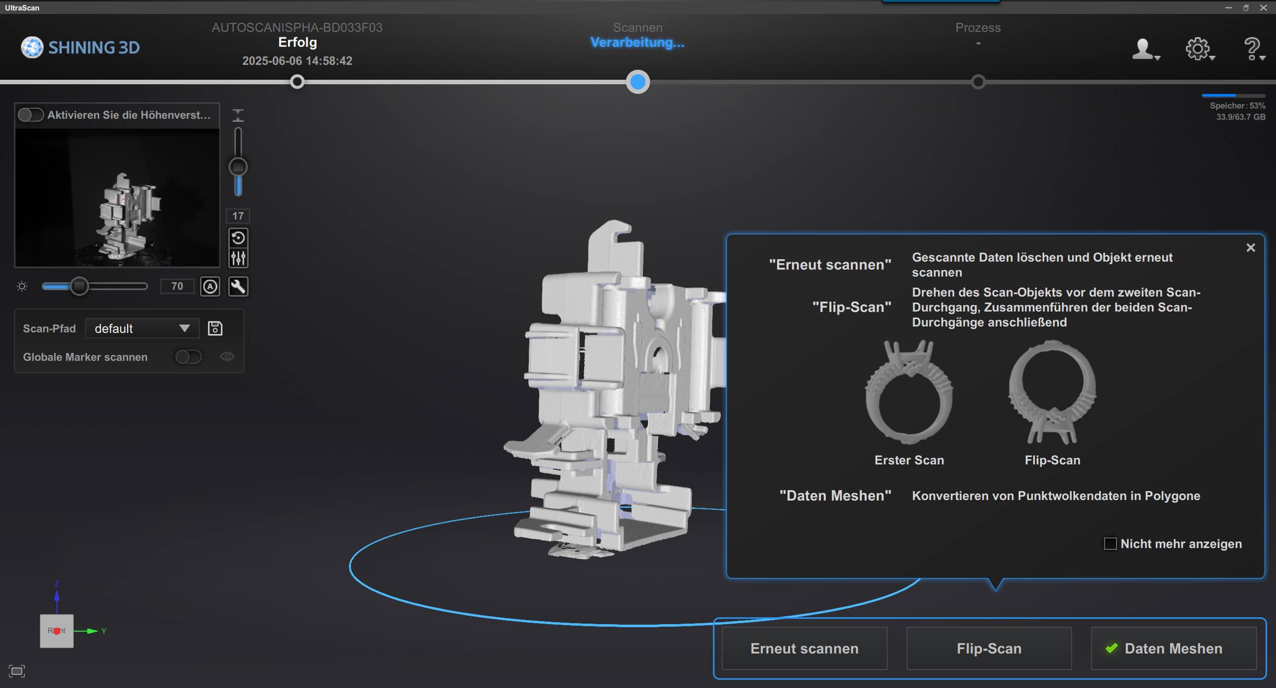 Nach Abschluss des Scans können Sie Daten bearbeiten oder direkt mit der Daten Meshen fortfahren.