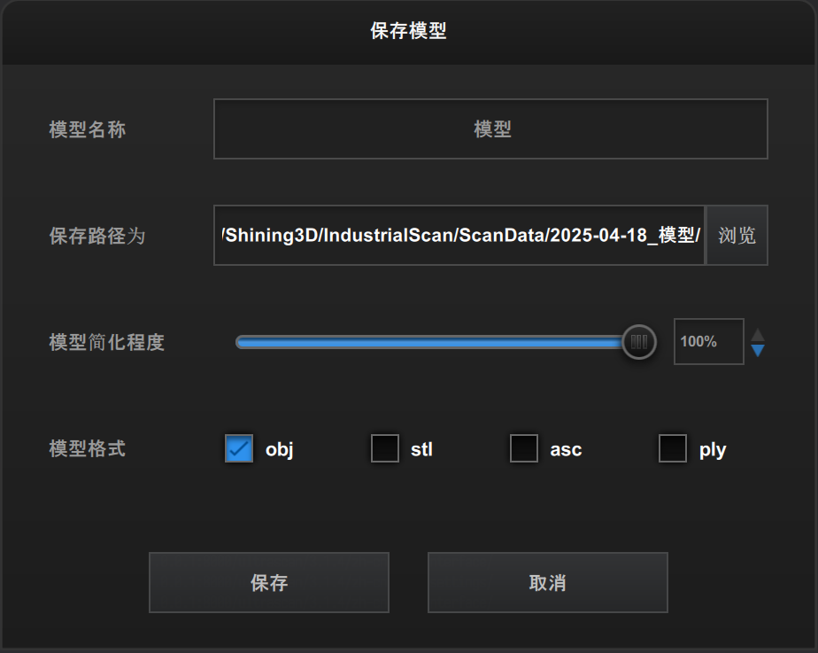 ,将扫描模型文件导出为 OBJ、STL、ASC 或 PLY 格式。