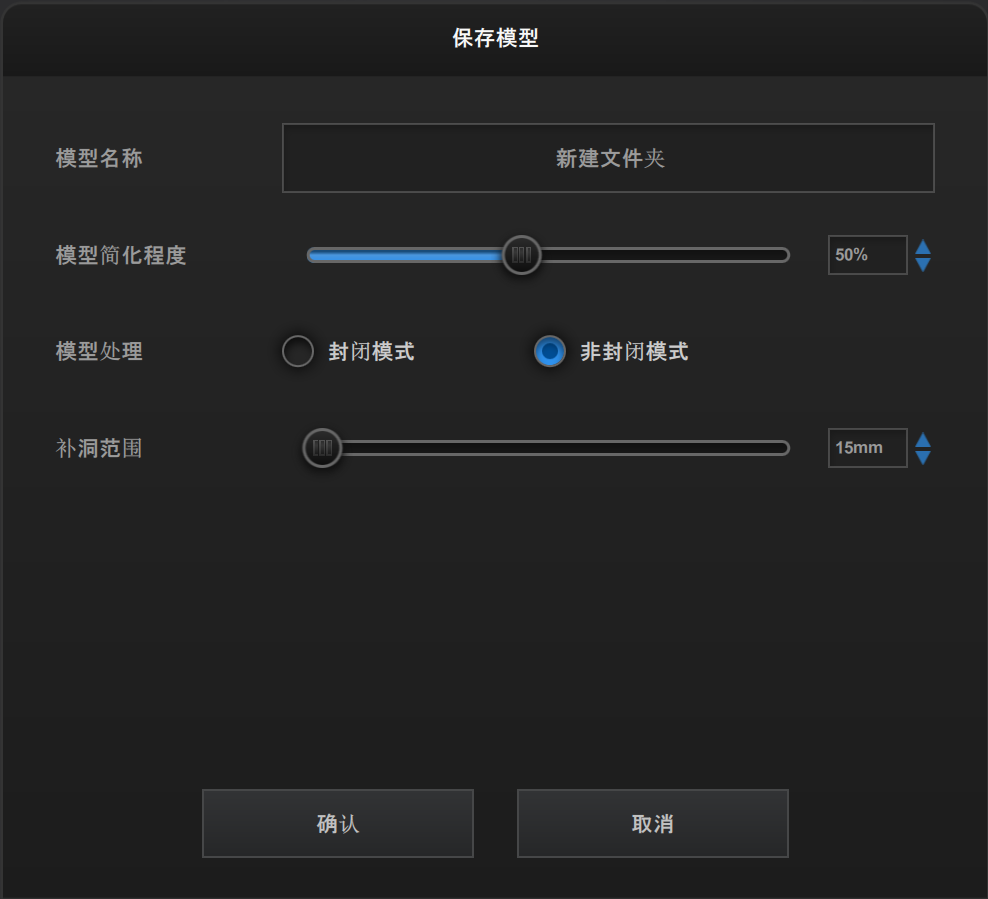 - 模型简化程度:指扫描数据的精细程度。简化值设置越大,得到的扫描数据精细度越高;简化值设置越小,得到的扫描数据精细度越低。