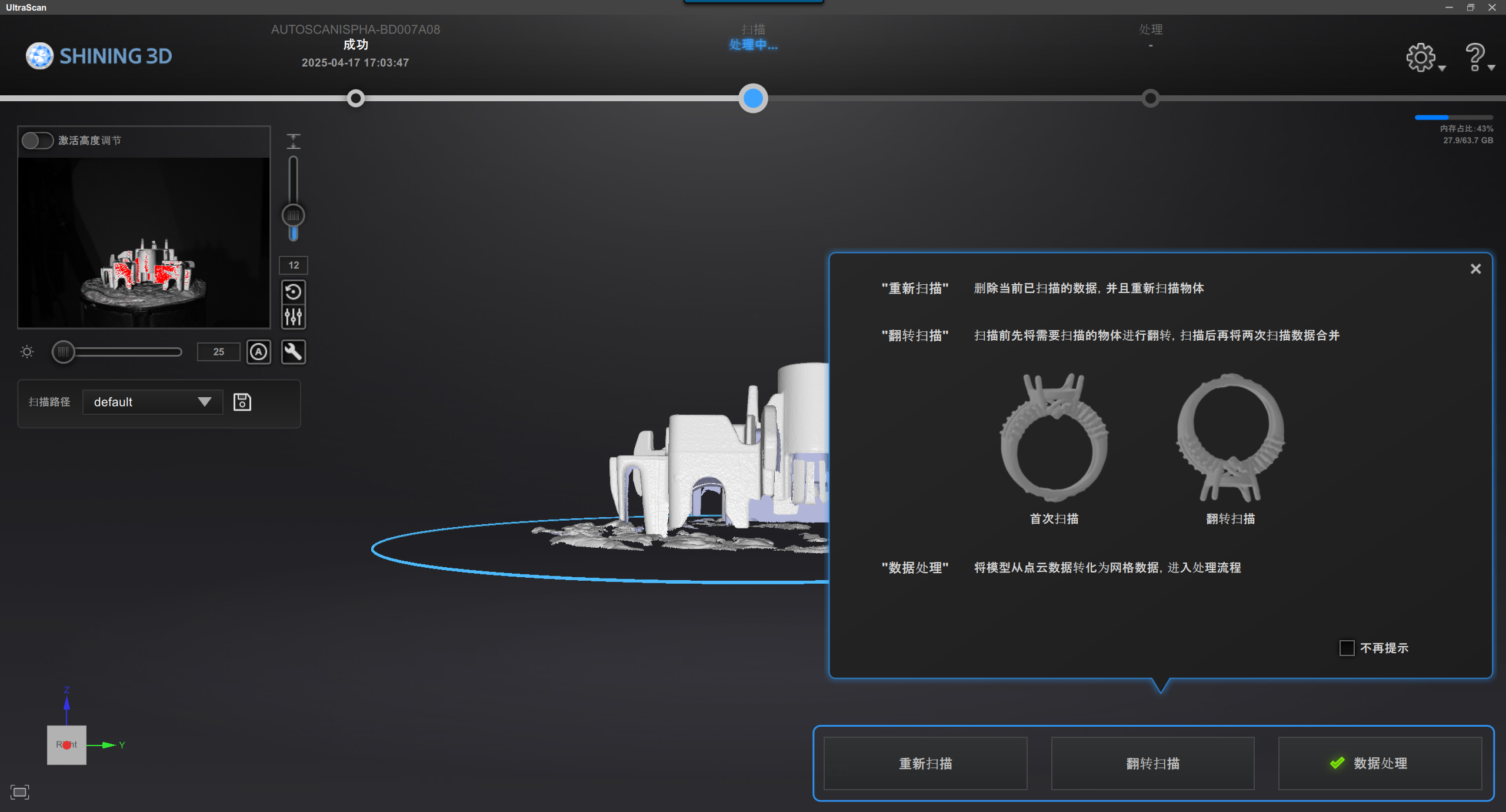 ,转台自动旋转至与模型视图相同角度,对模型进行补扫。 -