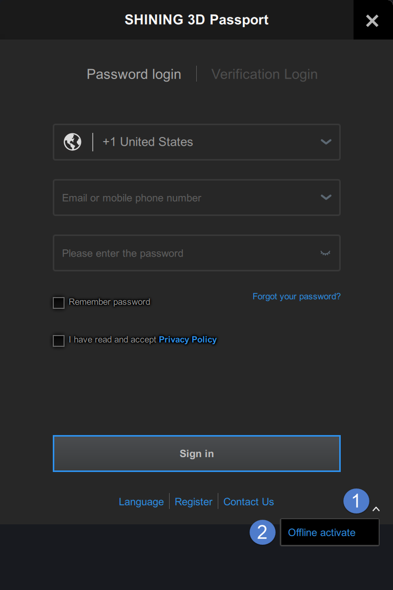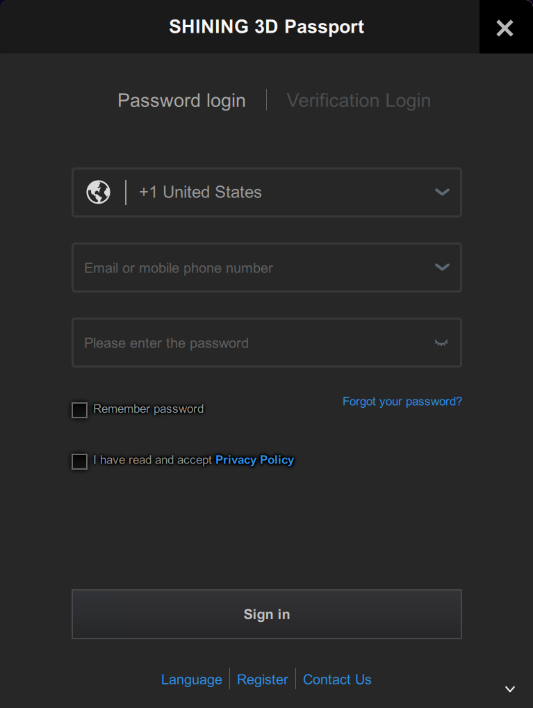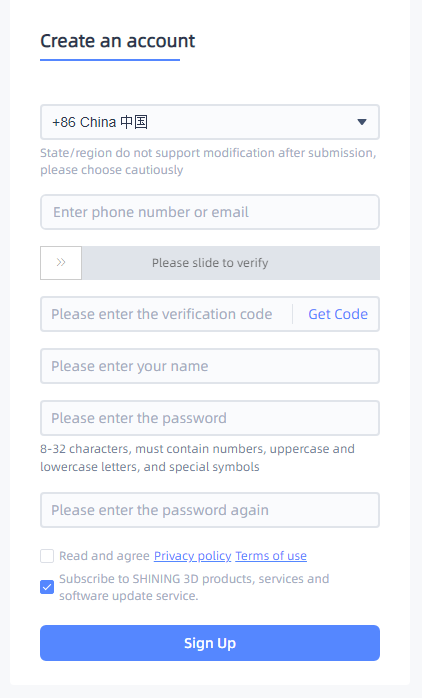 If you are a new user, please register a User Account first. You can click Register in the pop-up window when opening the software or click Sign Up in our User Account website: https://passport.shining3d.com/signup.