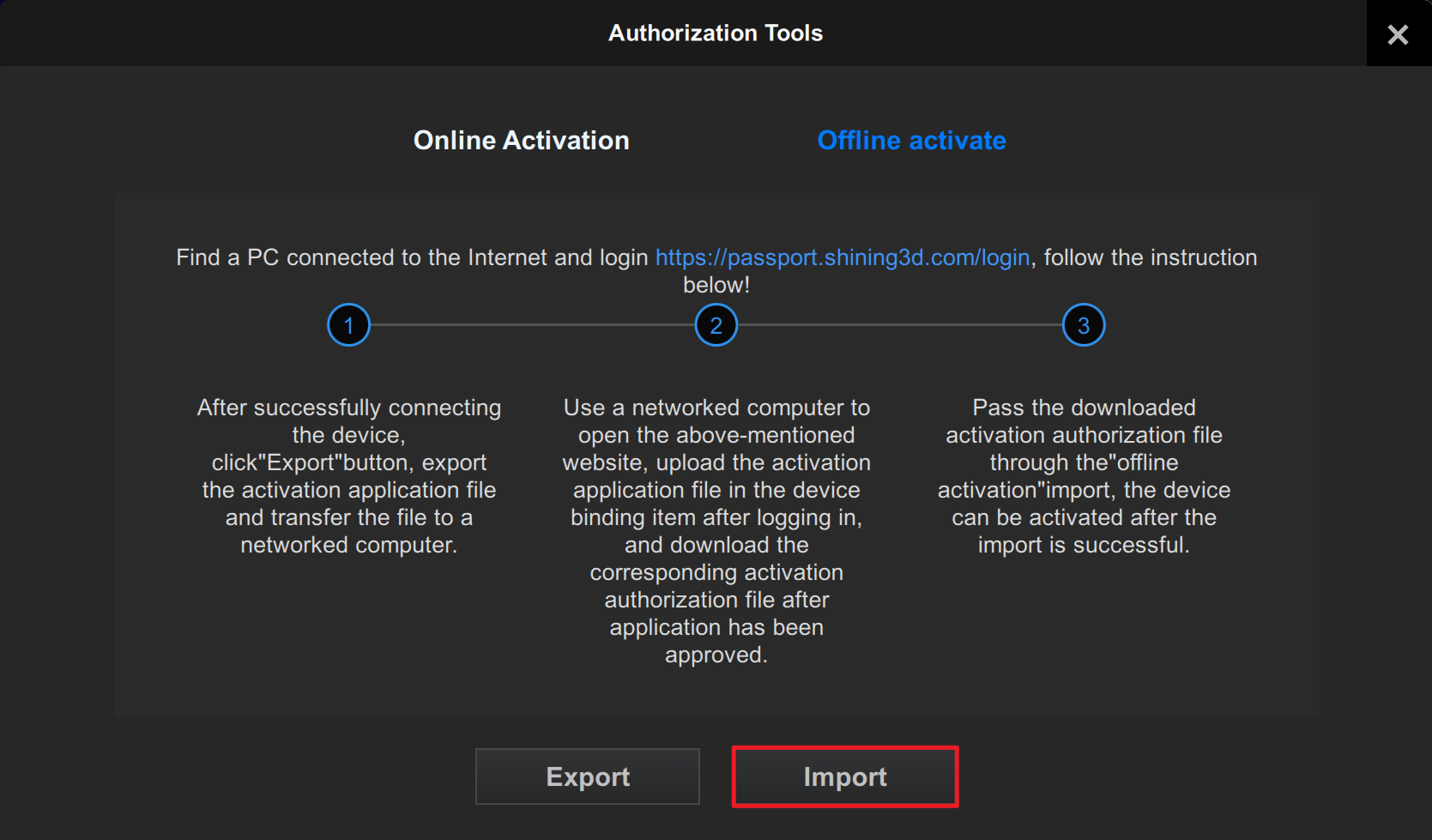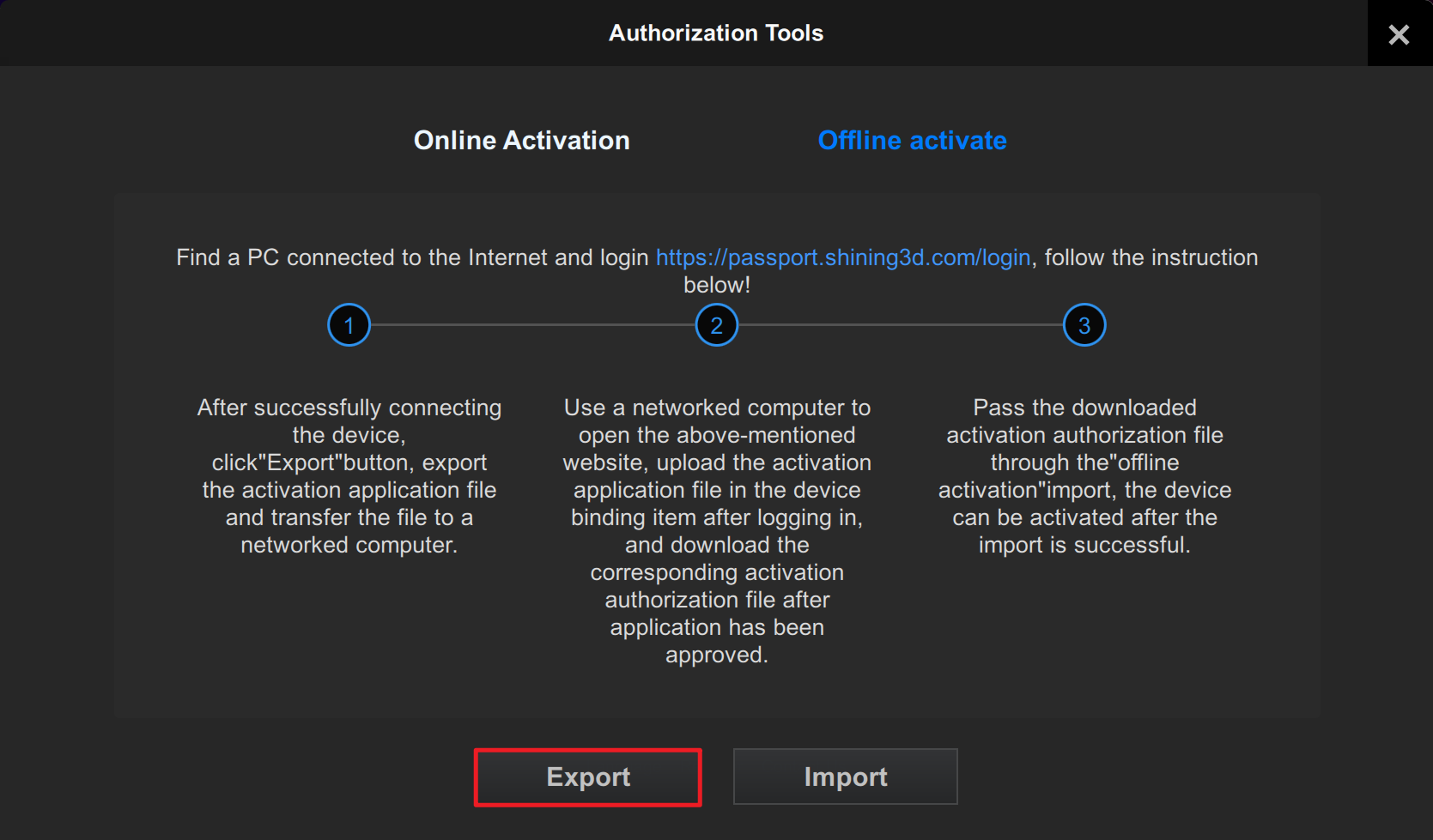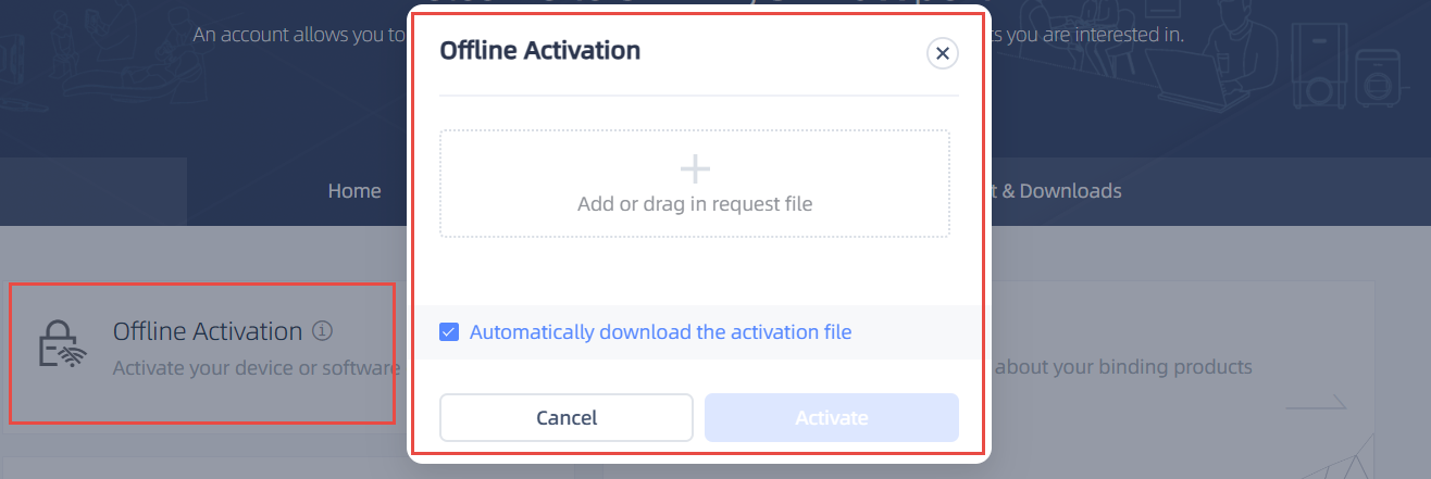 On the computer that is connected to the Internet, log in to https://passport.shining3d.com/, upload your C2V file in offline activation page, click Activation and go to the corresponding page to download the V2C file.