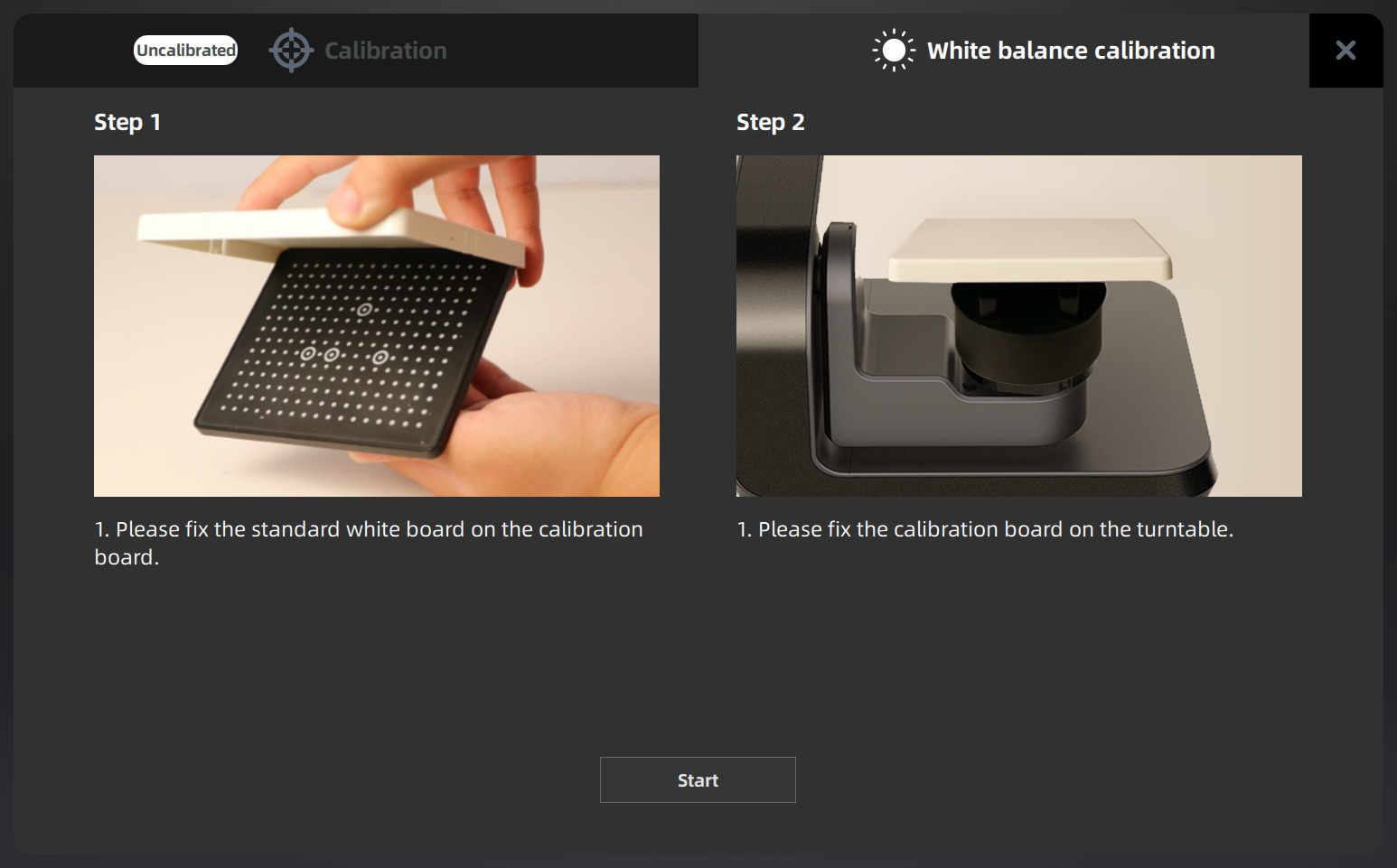 Click Start so that the turntable starts to spin and the white balance correction correction will processed automatically.